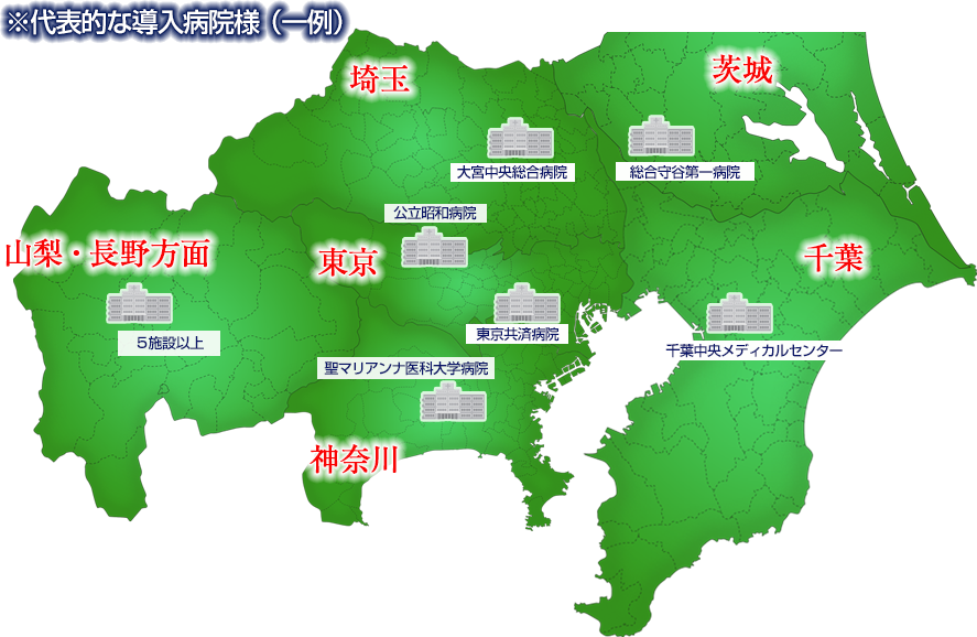 東京都、神奈川県、埼玉県、茨城県、山梨県、長野県を中心とした関東一円の施設さま(10,000床以上)に導入いただいております。